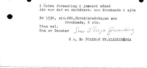 //// I Östra församling i januari månad //// där var det en skräddare, som drunknade i sjön //// ^ Nr 153O, sid.680,Skräddaredrängen som //// drunknade, 6 str. //// Utan mel. //// Kom av Dencker ! /^^^ ^^ //// H o, E: F0LKM:N FR.KLÄCKEBERGA ////