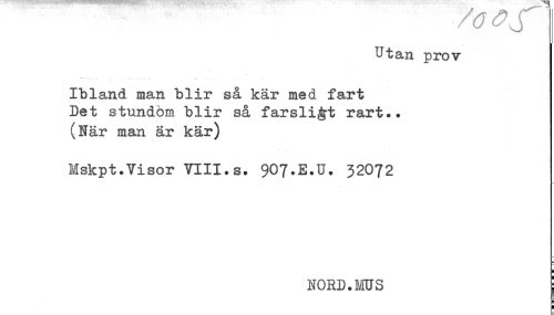 //// Utan prov //// Ibland man blir så kär med fart //// Det stundom blir så farsli^t rart.. //// (När man är kär) //// Mskpt.Visor VIII.s. 9O7.E.U. 32072 //// NORD.MUS i //// i ////