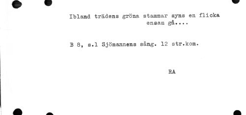 //// Ibland trädens gröna stammar syns en flicka //// ensam gå.... //// B 8, s.l Sjömannens sång. 12 str.kom. //// RA ////