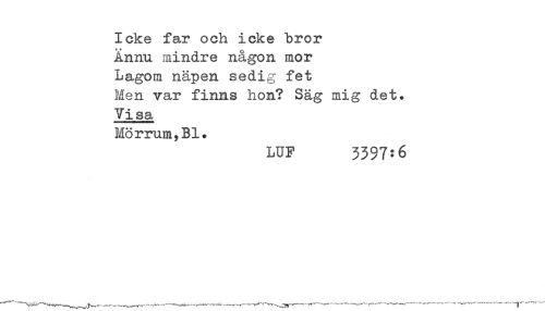 //// Icke far och icke bror //// Rnnu mindre någon mor //// Lagom näpen sedig fet //// Men var finns hon? Säg mig det. //// Visa //// Mörrum,Bl. //// LUF 3397:6 ////