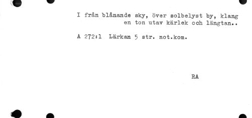//// I från blånande sky, över solbelyst by, klang //// en ton utav kärlek och längtan.. //// A 272:1 Lärkan 5 str. not.kom. //// RA ////
