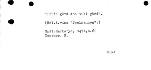 //// , "Ifrån gård éch till gård". //// ^^ (Mel.t.visa "Spelmannen".) //// i //// Smål.Markaryd, 8 471,s.6 2 //// Dencker, N. //// ULMA ////