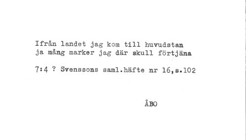 //// Ifrån landet jag kom till huvudstan i //// ja mång marker jag där skull förtjäna ' //// t //// 7:4 ? Svenssons saml.häfte nr 16,s.102 //// i //// ÅBO ////