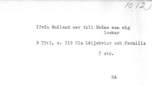 //// /a /^y //// Ifrån Småland ner till Skåne man mig //// lockar //// B 79:3, s. 219 Ola Liljekvist och Pernilla //// 7 str. //// RA ////