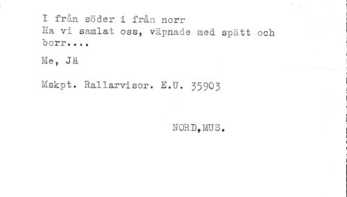 //// I från söder i från norr //// Ha vi samlat oss, väpnade med spätt och //// borr.... } //// < //// i //// Me, Jä - //// f //// Mskpt. Rallarvisor. E.U. 35903 ! //// ' //// ! //// NORD,ms. I //// ! //// ! //// - //// i ////