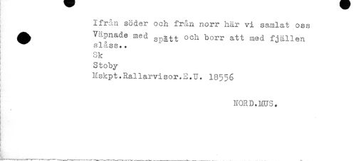 //// Ifrån söder och från norr här vi samlat oss //// ! ^ Väpnade med och borr att med fjällen //// i ^^ släss.. //// ; sk //// Stoby //// ; Mskpt.Rallarvisor.E.U. 18556 //// NORD.ms. //// B*' //// i*-- ////