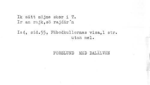//// Ik sätt möjne skor i T. //// Ir an rajk,sö rajdär^n //// I:4i sid.55, Fäbodkullornas visa,l str. //// utan mel. //// * //// FORSLUND H3D DALÄLVEN ////