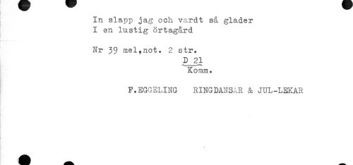 //// In slapp jag och vardt så gläder //// I en lustig örtagård //// Nr 39 mel,not. 2 str. //// D 21 //// Komm. //// F.EGGELING RINGDANSAR & JUL-LEKAR //// - ////