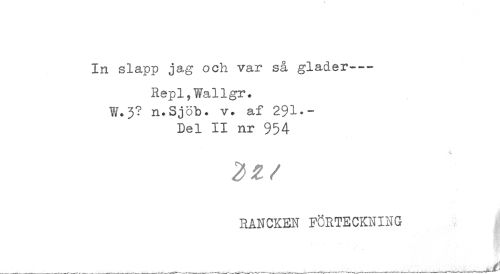 //// In slapp jag och var så gläder--- //// ReplyWallgr* //// W*3? n.Sjöb. v. af 291.- //// Del II nr 954 //// RANCKEN FÖRTECKNING ////