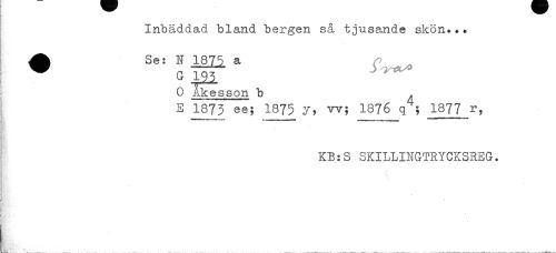 //// Inbäddad bland bergen så tjusande skön... //// # Se: N 1815. a ^ //// ; ^ G 195 //// O Åkesson b . //// E 1873 ee; 1875 y, vv; 1876 q^; 1877 r, //// '"*.............. - ^ ........ «.<)<"'- , , H . . - - U'. .<."!'' "' "* ^ //// KB:S SKILLINGTRYCKSREG. ////