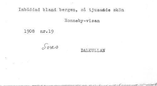 //// Inbäddad bland bergen, så tjusadde skön //// Ronneby-visan //// 1908 nr.19 //// DALKULLAN //// __^...... _ _ _____. ^ ^ . . - -sr-lf ////