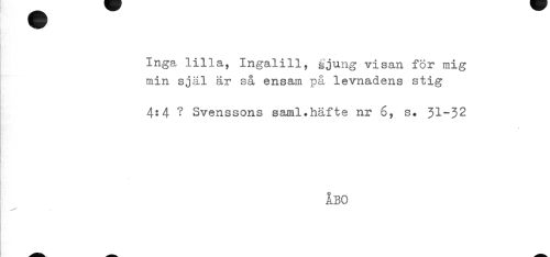 //// Inga lilla, Ingalill, sjung visan för mig //// min själ är så ensam på levnadens stig //// 4:4 ? Svenssons saml.häfte nr 6, s. 31^32 //// ÅBO ////