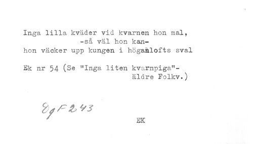 //// t //// Inga lilla kväder vid kvarnen hon mal, //// -så väl hon kan- //// hon väcker upp kungen i högaälofts sval //// Ek nr 54 (Se "Inga liten kvarnpiga"- //// äldre Folkv.) //// ^ EK ////