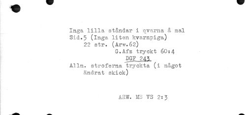 //// Inga lilla ståndar i qvarna å mal //// Sid.5 (inga liten kvarnpiga) //// 22 str. (Arw.62) //// G.Afz tryckt 60:4 //// DGF 243- //// Allm. stroferna tryckta (i något //// ändrat skick) //// i //// ARW. MS VS 2:3 ////