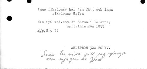 //// I Inga rikedomar har jag fått och inga //// rikedomar ärfva //// N:o 250 mel.not.Fr Särna i Dalarna, //// uppt.Ahlström 1855 //// Jmf.Nio 56 //// t //// -i //// AHLSTROH 300 FOLKV. ////