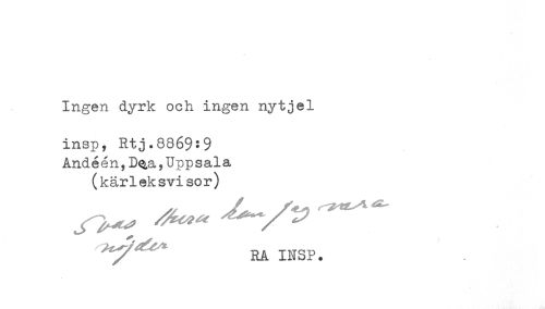 //// Ingen dyrk och ingen ny t j el //// insp, Rtj.8869:9 //// Andéén, D<aa,Uppsala //// (kärleksvisor) //// ' " RA INSP. ////