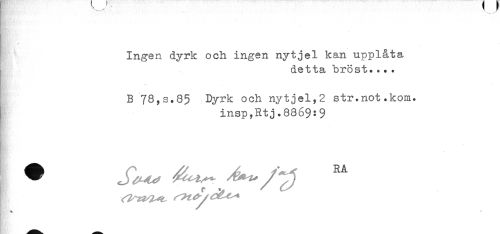 //// Ingen dyrk och ingen nytjel kan upplåta //// detta bröst.... //// . . - //// B 7S,s.85 Dyrk och nytjel,2 str.not.kom. //// insp,Rtj.8869:9 //// # ^ ^ ^ / //// . .. t ////