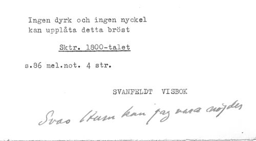 //// Ingen dyrk och ingen nyckel //// kan upplåta detta bröst //// Sktr. 1800-talet //// s.86 mel.not. 4 str. //// SVANFELDT VISBOK //// ___---—---.-----_____—-------,------—--*---—------—-------—----- ////