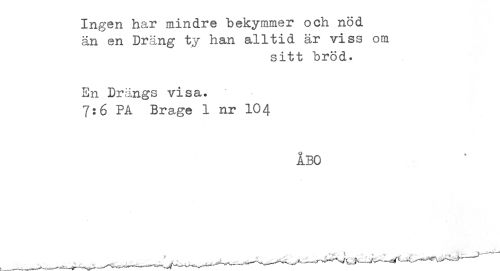 //// Ingen har mindre bekymmer och nöd //// än en Dräng ty han alltid är viss om //// sitt bröd. //// En Drängs visa. //// 7:6 PA Brage 1 nr 104 //// ÅBO ////