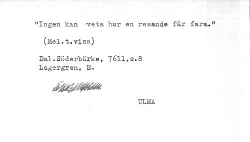 //// "Ingen kan veta hur en resande får fara." //// (Mel.t.visa) //// Dal.Söderbärke, 7611,s.8 //// Lagergren, E. //// ULMA ////