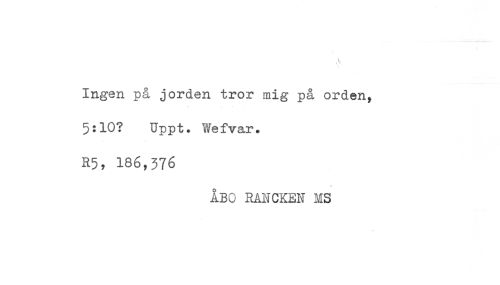 //// Ingen på jorden tror mig på orden, //// 5:10? Uppt. Wefvar. //// R5, 186,376 //// ÅBO RANCKEN MS ////