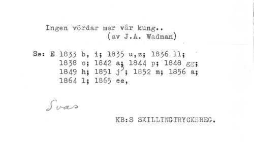 //// Ingen vördar mer vår kung*. //// (av J.A. Wadman) //// j j <* //// Se: E 1833 b, i; 1835 u,z; I836 11; //// 1838 o; 1842 a; 1844 p; 1848 gg; //// 1849 h; 1851 j ; 1852 m; 1856 a; //// I864 1; 1865 ee, //// KB:S SKILLINGTRYCKSREG. ////