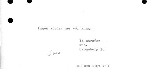 //// i //// Ingen vördar mer vår kung... //// i //// !' //// t //// i //// : //// 14 strofer //// mus. //// Croneborg 16 //// J ^ //// MS ms HIST MUS ////