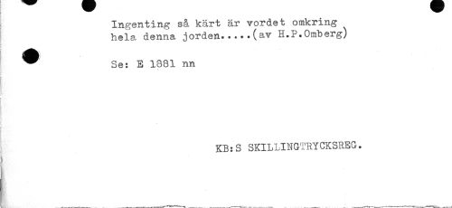 //// Ingenting så kärt är vordet omkring //// hela. denna jorden. ....(av H.P.Omberg) //// " Se: E 1881 nn //// ! //// ] //// KB:S SKILLINGTRYCKSREG. ////