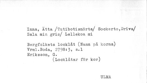 //// Inna, Åtta /Tutibotisnörta/ Sockerto,Driva/ //// Sala min gris/ Lellekoa mi //// Bergfolkets locklåt (Namn på korna) //// Vrml.Boda, 2798:3) s.l //// Eriksson, G. //// (Locklåtar för kor) //// * //// ULMA ////