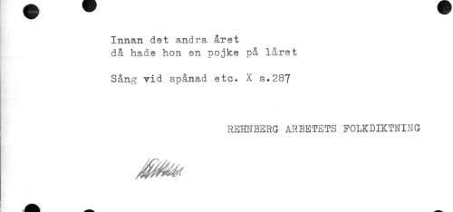 //// R //// Innan det andra året //// då hade hon en pojke på låret //// Så,ng vid spånad etc. X s.287 //// REHNBERG ARBETETS FOLKDIKTNING //// - //// ! ////