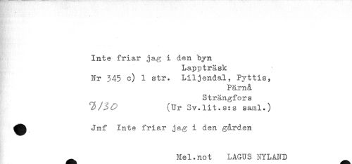 //// # ' //// Inte friar jag i den byn //// Lappträsk //// Nr 345 c) 1 str. Liljendal, Pyttis, //// Pärnå //// Strängfors //// (Ur Sv.lit.s:s saml.) //// ^^ Jmf Inte friar jag i den gården //// Mel. no t LAGUS NYLAND ////