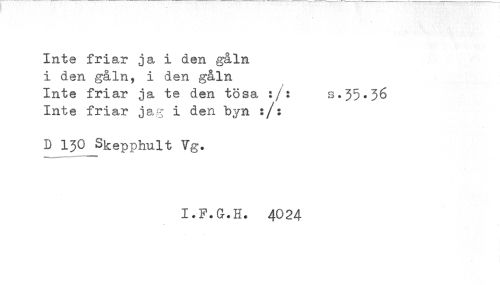 //// Inte friar ja i den gåln //// i den gåln, i den gåln //// Inte friar ja te den tösa :/: s.35.36 //// Inte friar jag i den byn :/: //// D 130J3kepphult Vg. //// i.F.G.H;. 4024 ////