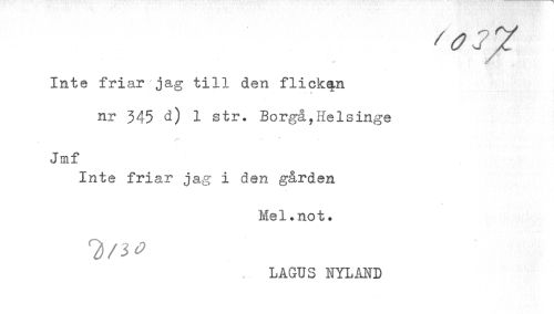 //// Inte friar jag till den flickan //// - v //// nr 345 d) 1 str. Borgå,Helsinge //// - //// Jmf //// Inte friar jag i den gården //// Mel.not. //// LAGUS NYLAND ////