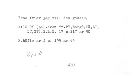 //// Inte friar jag till den gossen, //// 1:10 PY (mel.även fr.PY,Borgå,PÅ,LI, //// LT,ST).S.L.S. 17 s.117 nr 90 //// N.häfte nr 4 s. 195 nr 65 //// ÅBO ////