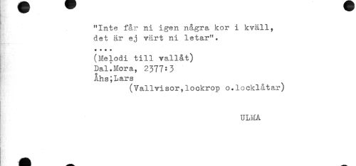 //// "Inte får ni igen några kor i kväll, //// det är ej värt ni letar". //// * * * + //// (Melodi till vallåt) //// DaliMora, 2377:3 //// Åhs;Lars //// (Vallvisor,lockrop o.locklåtar) //// ULMA //// Ek ////