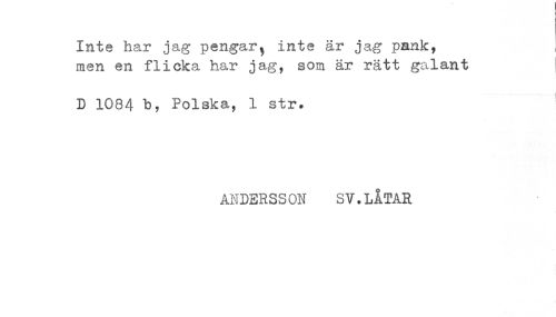 //// Inte har jag pengar, inte är jag pank, ! //// men en flicka har jag, som är rätt galant //// D 1084 h, Polska, 1 str. //// ANDERSSON SV. LÅTAR ////