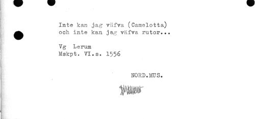 //// Inte kan jag väfva (Camelotta) //// j ^^ och inte kan jag väfva rutor... //// t' //// I Vg Lerum //// Mskpt. VI.s. 1556 //// NORD.MUS. //// * ////