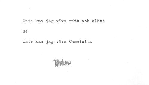 //// Inte kan jag väva rätt och slätt //// se //// Inte kan jag väva Camelotta ////