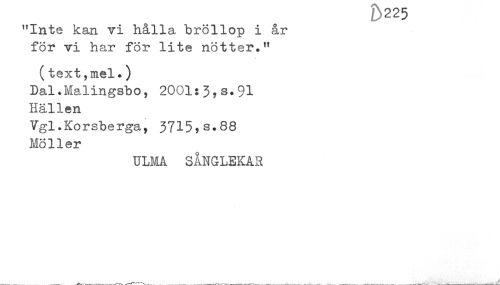 //// "Inte kan vi hålla bröllop i år //// för vi har för lite nötter." //// (text,mel.) //// Dal.Malingsbo, 2001:3,s.91 //// Hällen //// Vgl.Korsberga, 3715? s.88 //// Möller //// ULMA SÅNGLEKAR ////