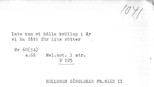 //// Inte kan vi hålla bröllop i år //// vi ha fått för lite rötter //// Nr 60(54) //// s.66 Mel.not. 1 str. //// D 225 //// HELLGREN SÅNGLEKAR FR.NÄÅS II ////