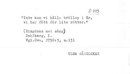 //// 225 //// .. < — //// "Inte kan vi hålla bröllop i år, //// vi har fått för lite rötter." //// (Ringdans med sång^ //// Dahlberg, 1. //// Vgl.Ova, 2750:3, s.131 //// ULMA SÅNGLEKAR ////