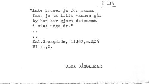 //// "Inte kruser ja för mamma //// fast ja tä lilla vännen går //// ty hon har gjort detsamma //// i sina unga år." //// * * //// * + //// Dal.Grangärde, 11482,s.$06 //// Blixt,0. //// ULMA SÅNGLEKAR ////
