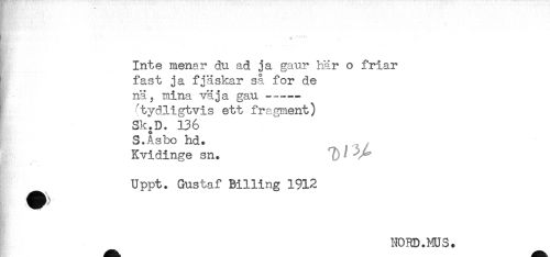 //// Inte menar du ad ja gaur här o friar //// ' fast ja fjäskar så for de //// nä, mina väja gau ----— //// 'tydligtvis ett fragment) //// Sk.D. 136 //// S.Åsbo hd. //// Kvidinge sn. D ? //// K * //// ^ Uppt. Gustaf Billing 1912 //// NORD.MUS. ////