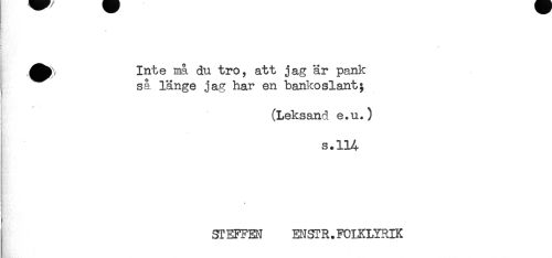 //// ! //// t //// ! f //// Inte må du tro, att jag är pank //// så länge jag har en bankoslant; //// (Leksand e*u.) //// s.114 //// ! //// v \ //// i //// ) //// STEFFEN ENSTR.FCIKLYRIK ////