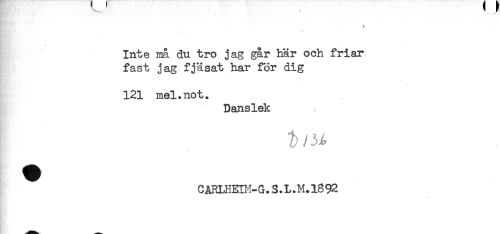 //// Inte må du tro jag går här och friar //// fast jag fjäsat har för dig //// 121 mel.not. //// Danslek //// É&h.'', //// t / ^ //// - //// CAKLHEIH-G. S.L.M.1892 //// - ////