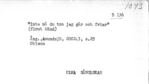 //// : 7 j //// D 136 //// "Inte ma du tro jag går och friar" ! //// (förut känd) //// * //// Ang. ,Amundsjö, 2002:3^ s.25 //// Ohlson //// i //// f //// ULMA SÄNGMKAR j ////