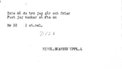 //// \ t //// f //// Inte må du tro jag går och friar //// Fast jag vankar så (fta om //// Nr 22 2 st.mel. //// i //// RINGL.SKANSEN UPPL.4 ////