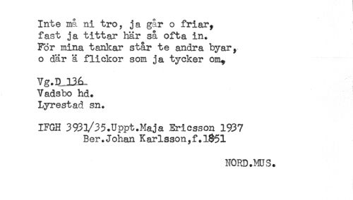 //// Inte må ni tro, ja går o friar, //// fast ja tittar här så ofta in. //// För mina tankar står te andra byar, //// o där ä flickor som ja tycker om, //// Vg.D_l%- //// Vadsbo hd. //// Lyrestad sn. //// IFGH 393l/35.Uppt.Maja Ericsson 1937 //// Ber.Johan Karlsson,f.1951 //// NORD.MUS. ////