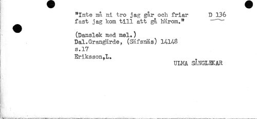 //// "Inte ma ni tro jag går och friar D 136 //// fast jag kom till att gå härom." //// (Danslek med mel.) //// Dal.Grangärdey (Säfsnäs) 14148 //// s.17 //// Eriks son . //// ULMA SANGLEKAR //// ! ////