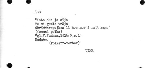 //// 388 //// t //// "Inte ska ja säja //// Te mi gamla tröja //// Skräddarepojken lå hos mor i natt,san." //// (lammal polka) //// Vgl.V.Tunhem,15l6:5,s.13 //// Madsén. //// (Polkett-texter) //// ULMA ////
